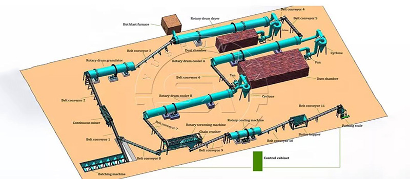This is the configuration of a complete large scale compound fertilizer making line. For mass fertilizer production, it is advisable to choose equipment with a large capacity and a high degree of automation. It can greatly shorten your time spent on compound fertilizer making. And can rotary drum pelleting line be used in small or medium compound fertilizer production? Of course, SX will change the design according to your requirements.